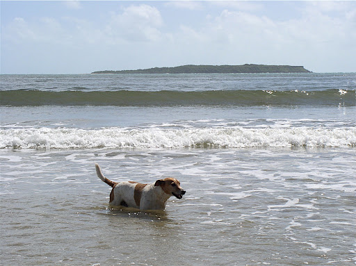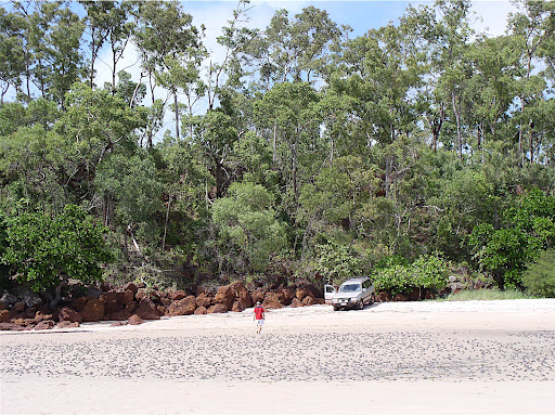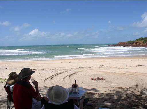 Saturday, Sue, Dave, Peggy and I drove to Rocky Point, a 40 minute drive although the distance as a crow flies it is only 25 km, using a Toyota 4 WD. This is the place where you need a 4 wheel drive vehicle. The scenery is just amazing, most of the roads are there because of previous bauxite mining. The sorroundings are full of eucaliptus trees. All the areas that have been mined have been rehabilitated with seeds of previous vegetation, in this case eucaliptus. We saw Dingos, wild dogs, and fresh tracks of Buffalos. After 40 minutes of driving we suddenly come up to the beach and the ocean. In front of us is the ARAFURA SEA, on our left is a river dicharging to the sea. Dave advises us not to go in the river's water because of the crocodile population. The sand is fine and almost white, the water an aquamarine color, clear. Bob the dog inmediatelly gets out of the car and runs to play in the water. He likes to chase sticks, however when I throw a stick to the water the sticks sinks and Bob can not find it. We get back in the car and drive along the beach towards the south east. The topography changes, a cliff appears in front of us, again the view is fantastic. We drive down to the beach and make camp for a picnic. We set up a nice wine, cheese and grapes. A wonderful Sauvignon Blanc, The Crowded House, from New Zeland. This wine can't get any better, nice bouquet, taste of pears. Then to swimming, It is safe to swim in this area, no crocs!!. Bob is real surfer, Dave puts him on top of a surf board and Bob goes into the ocean. He really enjoys it. I soon find out that he also is the lifeguard because when I start swiming away from him and deeper into the ocean he starts crying and barking. He does the same for anyone of us. After swimming for a while, Dave pulls out a kite. I have not flown a kite in years, this one is far more advanced than the kites I used to build back in my childhood in Ecuador. Made out of fiberglass, it is strong, and made to be flown in this type of winds. It takes a while to learn to control this kite and it is good exercise. I enjoyed it, I ask Peggy to add this toy for a father's day gift. A nice wish, maybe I'll get one. It is mid afternoon, we leave the beach and start our travel back to town through the bush. The Northern Territory has a lot to offer, this area is known as the TOP END and not the OUTBACK by the Australians. I can understand why the aborigines want to protect the area from tourism. We would not have had the opportunity to see this virgin land if it would have been filled with hotels, shops etc. You just have to see this area with your own eyes to appreciate the beauty of mother nature. THANKS DAVE AND SUE!!!