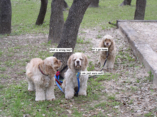We had an Invisible Fence installed around the perimeter of our lot his past Monday. Inmediately after the installation the training started for the dogs and yours truly. It consists of taking one dog at the time fitting it with a collar that has a sensor. When the dog walks to the perimeter of the lot a high pitch sound goes off and calls the dog's atention, at the same time the owner retrieves the dog inside the lot and praises him. I do this training twice a day for about 15 minutes for each dog. Sue, and Beemer have not problem with the sound. Simon is a little deaf and in addition to the sound we had to start him with a bit of shocking current. It is not bad on Simon, it just helps him know that he has reached the perimeter of the lot. The trtaining will take about 4 weeks and by that time they should know their boundary. We are spending a lot of time and having lots of fun together.